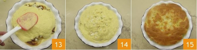 Bedecken Sie nun mit dem restlichen Teig und verteilen Sie ihn gleichmäßig mit einem Spatel 13. Fügen Sie den restlichen Scamorza hinzu und backen Sie den Kuchen in einem auf 180° vorgeheizten statischen Ofen für etwa 25 Minuten (oder bis er auf der Oberfläche gut gebräunt ist). Nehmen Sie den herzhaften Fenchel-Kuchen aus dem Ofen 15 und lassen Sie ihn abkühlen, bevor Sie ihn aus der Form nehmen.