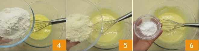 Fügen Sie nun auch das Mehl hinzu 4, mischen Sie die Mischung gut, um sie zu binden, dann den geriebenen Käse 5 und das Backpulver für herzhafte Zubereitungen 6.