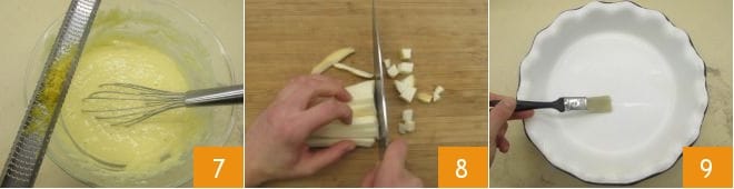 Arbeiten Sie alles weiter mit dem Handrührer, bis die Mischung glatt ist. Fügen Sie die Zitronenschale zum Teig hinzu 7 und mischen Sie. Schneiden Sie den Scamorza in Würfel 8. Fetten Sie eine Kuchenform mit einem Durchmesser von 26 cm leicht mit Öl ein 9,