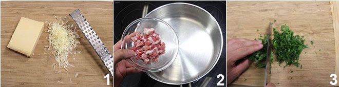 Um die herzhaften Kräuterpfannkuchen zuzubereiten, beginnen Sie damit, den Greyerzer grob zu reiben 1 und legen Sie ihn beiseite. Braten Sie die Speckwürfel in einer beschichteten Pfanne ohne Zugabe von Fett an 2 und lassen Sie sie bei niedriger Hitze goldbraun werden. Dann lassen Sie sie abtropfen und halten sie bereit. Hacken Sie die Kräuter separat: den Schnittlauch, das Basilikum und die Petersilie 3.