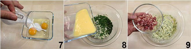 In einer separaten kleinen Schüssel schlagen Sie die Eier mit der Milch 7 und geben die entstandene Flüssigkeit in die Schüssel mit den restlichen trockenen Zutaten 8. Mischen Sie gut, bis Sie eine weiche und homogene Masse erhalten, fügen Sie die gebräunten Speckwürfel hinzu 9, salzen und pfeffern Sie und mischen Sie ein letztes Mal.