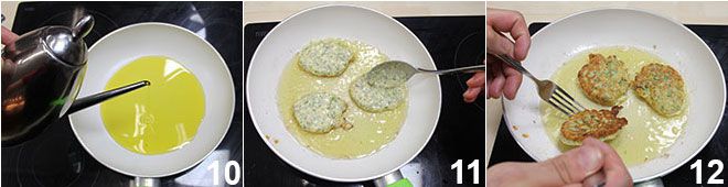 In einer kleinen beschichteten Pfanne geben Sie 2 Esslöffel extra natives Olivenöl 10 und erhitzen es auf dem Herd: nehmen Sie jeweils 3 Esslöffel Teig und legen Sie sie in die Pfanne 11, formen Sie 3 Pfannkuchen, die Sie auf beiden Seiten braten, bis sie goldbraun sind 12. Nehmen Sie die Pfannkuchen aus der Pfanne, lassen Sie sie auf Küchenpapier abtropfen und halten sie warm; geben Sie einen weiteren Esslöffel Olivenöl in die Pfanne und braten Sie die restlichen Pfannkuchen auf die gleiche Weise.