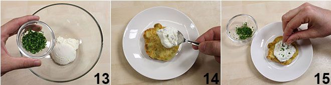 Bereiten Sie die Creme zu, die als Beilage zu den herzhaften Pfannkuchen dient, indem Sie in einer kleinen Schüssel die saure Sahne (oder den griechischen Joghurt) und einen halben Esslöffel gehackten Schnittlauch 13, das Salz und den Pfeffer gleichmäßig vermischen. Servieren Sie die herzhaften Kräuterpfannkuchen mit einem Löffel Creme auf jedem 14 und einer Prise übrig gebliebenem Schnittlauch 15.