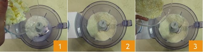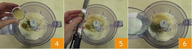 den gehackten Rosmarin, den Kümmel, den gemahlenen Ingwer 4, schwarzen Pfeffer, Muskatnuss 5, Salz und schließlich die Milch 6.
