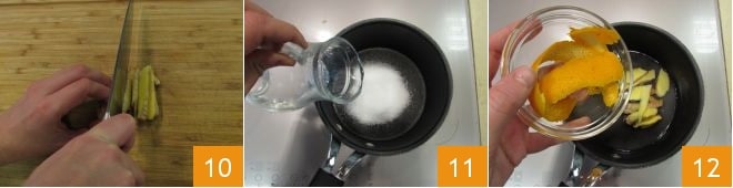 In der Zwischenzeit bereiten Sie den Sirup für den Spritz zu. Schneiden Sie zuerst den Ingwer in dünne Scheiben 10. Geben Sie Zucker und Wasser 11, den Ingwer und die Orangenschale in einen kleinen Topf 12,