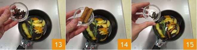 den Sternanis 13, die Zimtstangen 14, den Rosmarin und zuletzt die Pfefferkörner 14.