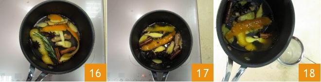 Bringen Sie es zum Sieden 16 und lassen Sie es dann sehr sanft etwa eine halbe Stunde köcheln 17. Lassen Sie es am Ende abkühlen und filtern Sie dann den Sirup 18, wobei Sie jedoch die kandierten Orangenschalen, den Zimt und einige Ingwerscheiben für die Dekoration der Gläser aufbewahren.