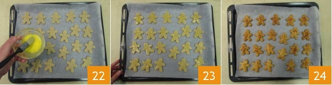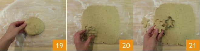Holen Sie den festgewordenen Teig heraus und legen Sie ihn auf eine leicht bemehlte Fläche 19; rollen Sie ihn mit einem Nudelholz auf einer leicht bemehlten Arbeitsfläche auf eine Dicke von etwa ½ cm aus. Mit einem Ausstecher in der Form eines Lebkuchenmanns formen Sie Ihre Lebkuchen (20-21)