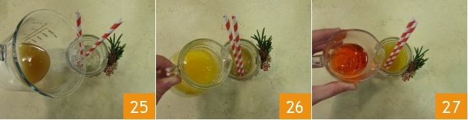 Kümmern Sie sich um die Spritz: Verteilen Sie den Sirup in 4 Gläsern (mit Eis nach Belieben) 25 und fügen Sie in jedem 50 g Orangensaft 26, 70 g Aperol 27 hinzu,