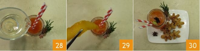 100 g Prosecco 28 und rühren Sie um. Vervollständigen Sie es mit Orange, kandiertem Ingwer, Zimt, die Sie beiseite gelegt hatten 29, und servieren Sie sofort Ihre Fest-Spritz, begleitet von den herzhaften Lebkuchen 30.