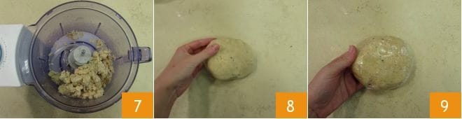 Aktivieren Sie die Messer erneut, bis der Teig kompakt ist, ohne ihn zu überhitzen 7. Übertragen Sie ihn auf die Arbeitsfläche, formen Sie ihn zu einem flachen Block 8, wickeln Sie ihn in Frischhaltefolie 9 und stellen Sie ihn für eine halbe Stunde in den Kühlschrank, um ihn zu festigen.