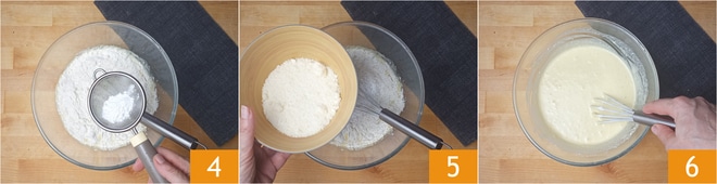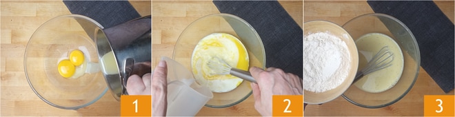Um die herzhaften Pfannkuchen zuzubereiten, schmelzen Sie zuerst die Butter in einem kleinen Topf bei niedriger Hitze oder in der Mikrowelle. In der Zwischenzeit trennen Sie die Eigelbe von den Eiweißen. In die Schüssel mit den Eigelben geben Sie die abgekühlte Butter 1, fügen die Milch langsam hinzu und rühren um 2. Fügen Sie nun das Salz, den Pfeffer und das Mehl hinzu 3.