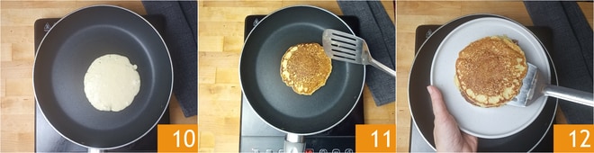 Backen Sie den Pfannkuchen auf einer Seite bei niedriger Hitze, bis sich die ersten Blasen an der Oberfläche bilden 10. Drehen Sie den Pfannkuchen mit einem Spatel um und beenden Sie das Backen für eine Minute auf der anderen Seite 11. Fahren Sie so fort, bis der gesamte Teig aufgebraucht ist. Die herzhaften Pfannkuchen sind fertig 12.