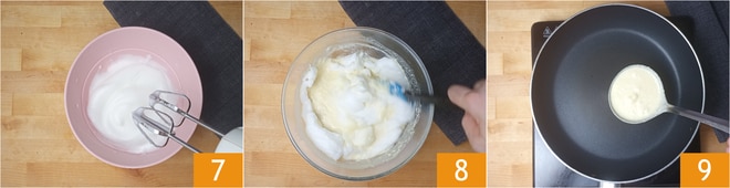 Schlagen Sie die Eiweiße mit einem elektrischen Mixer steif 7, dann fügen Sie sie nach und nach zur Eigelbmischung hinzu und heben sie vorsichtig von unten nach oben unter 8. Fetten Sie eine Antihaft-Pfanne leicht ein. Gießen Sie eine nicht volle Kelle Teig hinein 9.