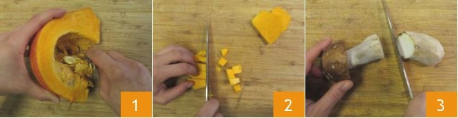 Um die herzhafte Pie zuzubereiten, kümmern Sie sich zuerst um die Reinigung des Kürbisses: Schneiden Sie ihn in Scheiben, entfernen Sie die inneren Samen 1, die Schale und schneiden Sie ihn dann in Würfel 2. Jetzt gehen Sie zur Reinigung der Pilze über: Entfernen Sie den erdigen Teil des Stiels der Steinpilze 3