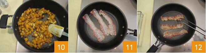 Sobald die Kürbis und die Pilze fertig sind, schalten Sie die Hitze aus und stellen Sie sie beiseite 10. Erhitzen Sie eine Pfanne, legen Sie die Speckscheiben hinein 11 und braten Sie sie bei hoher Hitze, um sie knusprig zu machen 12, es reichen 1-2 Minuten.