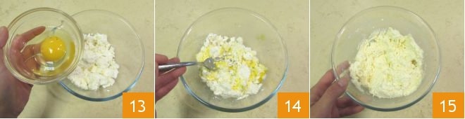 In einer Schüssel geben Sie den gut abgetropften Ricotta und das Ei 13. Mischen Sie mit einer Gabel 14, um eine homogene Creme zu erhalten 15.