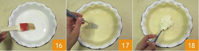 Fetten Sie eine 18 cm Durchmesser Kuchenform ein 16 und legen Sie eine Teigscheibe hinein, stechen Sie den Boden mit den Zinken einer Gabel ein 17. Füllen Sie mit der Hälfte der Ricottacreme 18.