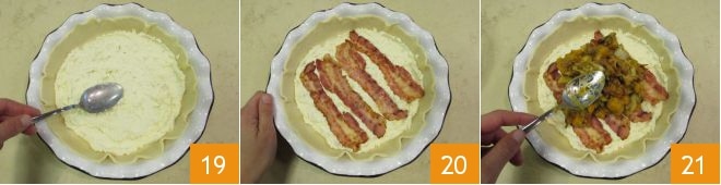 Glätten Sie mit der Rückseite eines Löffels 19, legen Sie die Hälfte der knusprigen Speckscheiben darauf 20 und bedecken Sie mit der Hälfte des in der Pfanne gebratenen Gemüses 21.