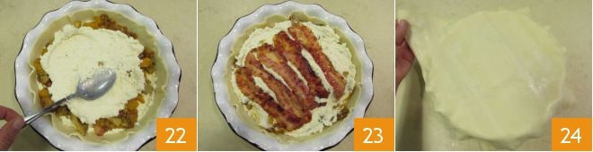 Jetzt erstellen Sie eine zweite Schicht mit der restlichen Creme 22, dem Speck 23 und dem Gemüse, bis die Füllung aufgebraucht ist. Bedecken Sie die Pie mit einer weiteren Schicht Teig 24, so dass die beiden Teigblätter am Rand zusammenkommen.