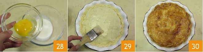 Schneiden Sie den überschüssigen Rand ab 25 und falten Sie den gesamten Teig über den Rand 26. Drücken Sie leicht mit den Zinken einer Gabel auf den Rand und stechen Sie dann die Oberfläche des Teigs ein 27, damit er beim Backen nicht aufbläht.