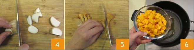 Und dann, nachdem Sie sie mit einem Tuch abgewischt haben, um die Unreinheiten zu entfernen, schneiden Sie sie in Stücke 4. Reinigen Sie die Pfifferlinge auf die gleiche Weise und teilen Sie sie dann der Länge nach 5. Erhitzen Sie in einem Topf einen Schuss Olivenöl und geben Sie dann den Kürbis hinzu 6.