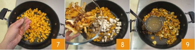 Würzen Sie mit einem Zweig frischem Thymian 7. Braten Sie den Kürbis ein paar Minuten an und fügen Sie dann die Pilze hinzu 8. Gießen Sie eine Kelle Brühe dazu 9 und kochen Sie weiter, bis Sie eine weiche Beilage erhalten, wobei Sie bei Bedarf Brühe hinzufügen, es dauert etwa 10 Minuten.