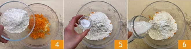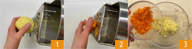 Um die herzhafte Rettungs-Torte zuzubereiten, schälen Sie zuerst die Kartoffeln 1 und Karotten 2 und reiben Sie sie fein. Geben Sie das geriebene Gemüse in eine große Schüssel 3.