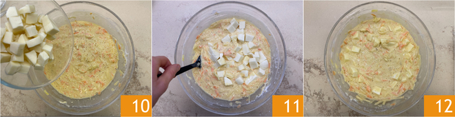Wenn Sie einen homogenen Teig erhalten haben, fügen Sie die in Würfel geschnittene Provola 10 hinzu und mischen Sie erneut 11, um sie gleichmäßig zu integrieren 12. Gießen Sie den erhaltenen Teig in eine mit Backpapier ausgelegte Form von 32x26 cm.