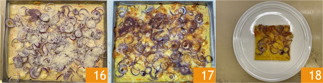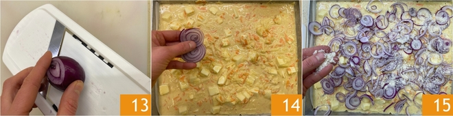 Schneiden Sie nun die rote Zwiebel mit Hilfe einer Mandoline fein 13. Verteilen Sie die Zwiebel auf der Oberfläche des Teigs 14, dann bestreuen Sie sie mit geriebenem Parmigiano Reggiano 15.