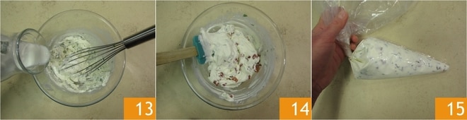 dann die Sahne hinzufügen, um die Mischung zu erweichen 13, und nochmals mischen. Geben Sie die knusprigen Speckwürfel hinzu und rühren Sie mit einem Spatel um, um sie zu integrieren. Füllen Sie die Mischung in einen Spritzbeutel 15