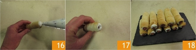 und verwenden Sie ihn, um die Blätterteigröllchen zu füllen 16. Versuchen Sie, sie so voll wie möglich zu machen 17. Fahren Sie auf diese Weise fort, bis alle Zutaten verbraucht sind, und servieren Sie sie!