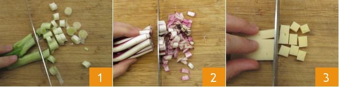 Um den herzhaften Kuchen mit Radicchio zuzubereiten, waschen und stutzen Sie zuerst die Frühlingszwiebel und schneiden Sie sie dann in Ringe 1. Machen Sie dasselbe mit dem Radicchio 2, wobei Sie darauf achten, etwa zehn ganze Blätter für die endgültige Dekoration beiseite zu legen. Schneiden Sie nun den Asiago-Käse in Würfel 3.