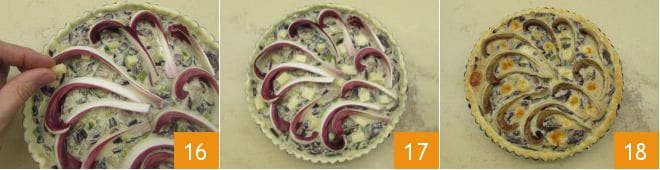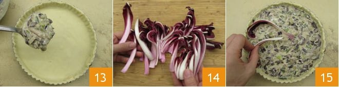 Füllen Sie nun den herzhaften Kuchen mit der Füllung 13, nehmen Sie die beiseite gelegten Radicchioblätter 14 und legen Sie sie so auf die Oberfläche, dass ein Strahlenmuster entsteht 15.
