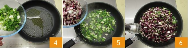 Erhitzen Sie einen Schuss Olivenöl in einer Pfanne und fügen Sie die Frühlingszwiebel hinzu 4. Braten Sie sie 5 Minuten lang an. Fügen Sie auch die Radicchiostücke hinzu 5, salzen und pfeffern Sie 6 und braten Sie sie 3-4 Minuten lang an, sie sollten knackig bleiben.