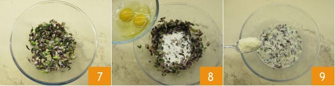 Geben Sie das Gemüse in eine Schüssel 7, fügen Sie die flüssige Sahne und die ganzen Eier hinzu 8, mischen Sie und würzen Sie schließlich mit dem geriebenen Käse 9.