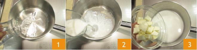 Um die herzhaften Windbeutel mit Grana Padano Creme zuzubereiten, beginnen Sie mit der Zubereitung des Brandteigs: Zuerst geben Sie Wasser 1, Milch 2 und Salz in einen Topf. Fügen Sie auch die in Würfel geschnittene Butter 3 hinzu und bringen Sie alles zum Kochen.