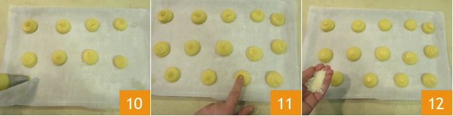 Zu diesem Zeitpunkt nehmen Sie ein Backblech und legen es mit Backpapier aus; damit es am Blech haftet, drücken Sie ein wenig Teig in die gegenüberliegenden Ecken und in die Mitte, damit es als Kleber dient. Drücken Sie Teighäufchen in der Größe einer Walnuss 10 aus, indem Sie sie voneinander entfernen. Sobald das Blech gefüllt ist, drücken Sie die Oberflächen der Kugeln leicht flach, um die Spitze der Windbeutel abzuschwächen 11. Bestreuen Sie jeden Windbeutel mit 10 g Grana Padano DOP 12. Backen Sie im vorgeheizten statischen Ofen bei 220° für etwa 15 Minuten, bis sie goldbraun sind. Vermeiden Sie es, den Ofen in dieser Phase zu öffnen. Nach dieser Zeit beenden Sie das Backen bei 180° für weitere 15-20 Minuten, indem Sie das Ventil öffnen und eine Kugel aus Alufolie zwischen die Tür und die Struktur des Ofens klemmen.