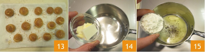 Entfernen Sie die Windbeutel aus dem Ofen und lassen Sie sie abkühlen, bevor Sie sie füllen 13. Bereiten Sie die Grana Padano DOP Creme zu: Geben Sie die Butter 14 in einen Topf und schmelzen Sie sie bei mittlerer Hitze, fügen Sie dann den Pfeffer hinzu und geben Sie das Mehl dazu 15
