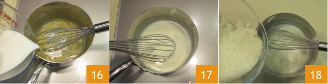Rühren Sie schnell mit einem Schneebesen um, dann gießen Sie die Vollmilch 16 ein und bringen Sie sie zum Kochen, bis sie eindickt. Sobald sie eingedickt ist 17, schalten Sie die Hitze aus, geben Sie den Grana Padano DOP 18 dazu und rühren Sie, um ihn zu schmelzen.