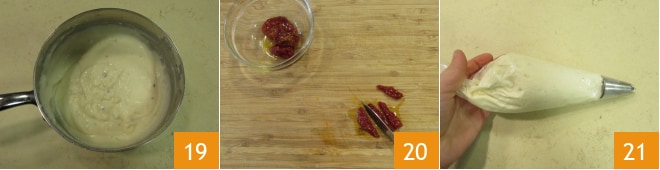 Lassen Sie die Creme bei Raumtemperatur abkühlen 19. Dann stellen Sie die Creme in den Kühlschrank, um sie komplett abzukühlen. In der Zwischenzeit lassen Sie die Tomaten abtropfen und schneiden Sie sie in dünne Streifen 20. Sobald die Creme kalt ist, geben Sie sie in einen Spritzbeutel mit einer Sterntülle 21.