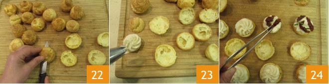 Schneiden Sie die mittlerweile kalten Windbeutel in der Mitte durch 22. Füllen Sie die Basis der Windbeutel mit der Grana Padano DOP Creme 23 und mit den Tomaten 24.