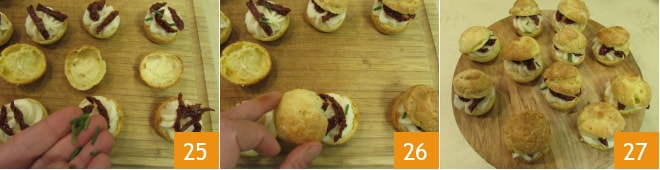 Aromatisieren Sie mit Schnittlauch 25 und bedecken Sie die Windbeutel mit der anderen oberen Hälfte 26. Die herzhaften Windbeutel mit Grana Padano Creme sind bereit zum Genießen 27.