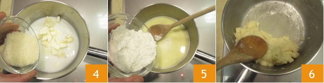 Geben Sie auch 20 g Grana Padano DOP 4 hinzu und rühren Sie mit einem Spatel oder Holzlöffel um. An diesem Punkt fügen Sie das Mehl in einem Schwung hinzu 5 und rühren Sie. Haben Sie keine Angst vor Klumpen und rühren Sie schnell, dann kochen Sie die Masse, bis sich ein weißer Film auf dem Topfboden gebildet hat, dies dauert mindestens 2-3 Minuten 6.