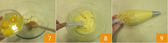 Übertragen Sie den so erhaltenen Teig in eine Schüssel und fügen Sie nacheinander ein Ei nach dem anderen hinzu 7, wobei Sie ständig umrühren, um es einzuarbeiten. Machen Sie sich keine Sorgen, wenn der Teig am Anfang getrennt erscheint, rühren Sie weiter. Erst wenn jedes Ei vollständig eingearbeitet ist, können Sie das nächste hinzufügen. Nachdem die Eier eingearbeitet sind, sollten Sie einen glatten und festen Teig erhalten 8. Dann geben Sie ihn in einen Spritzbeutel mit einer glatten Tülle von 12-13 mm 9.