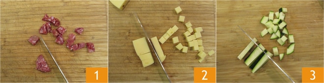 Um den herzhaften Gugelhupf vorzubereiten, schneiden Sie zuerst die Salami 1 und den Käse 2 in Würfel von etwa 1 cm, dann putzen Sie die Zucchini und schneiden Sie diese ebenfalls in Würfel von 1 cm 3.