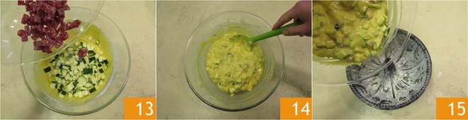 Vervollständigen Sie mit der Salami 13 und dem Käse. Mischen Sie alles mit einem Spatel 14 und legen Sie es zur Seite. Ölen und mehlen Sie eine Gugelhupfform mit einem Durchmesser von 24 cm und einer Höhe von 10 cm, dann füllen Sie den Teig hinein 15