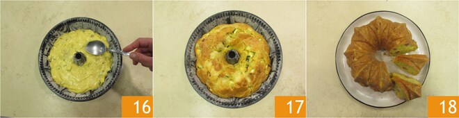 Glätten Sie die Oberfläche mit einem Löffel 16. Backen Sie bei 180° in einem vorgeheizten statischen Ofen für 50-55 Minuten oder bis zur vollständigen Garung und Bräunung der Oberfläche. Nehmen Sie den herzhaften Gugelhupf aus dem Ofen und lassen Sie ihn abkühlen 17, bevor Sie ihn stürzen und in Scheiben servieren 18!