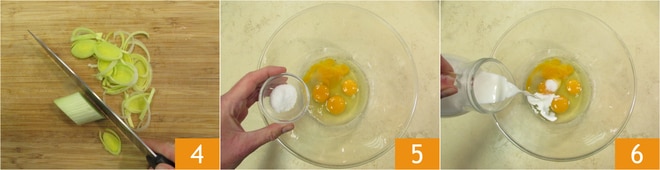 Entfernen Sie den grünen Teil und die Basis des Lauchs, dann entfernen Sie die äußere Schicht und schneiden Sie ihn dünn 4. In einer großen Schüssel die Eier, das Salz 5 und die Milch 6 einfüllen.