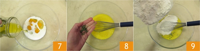 Fügen Sie auch das extra native Olivenöl 7 hinzu. Mischen Sie die Zutaten kräftig mit einem Schneebesen. Aromatisieren Sie mit den Thymianblättchen 8, dann integrieren Sie das Mehl 9
